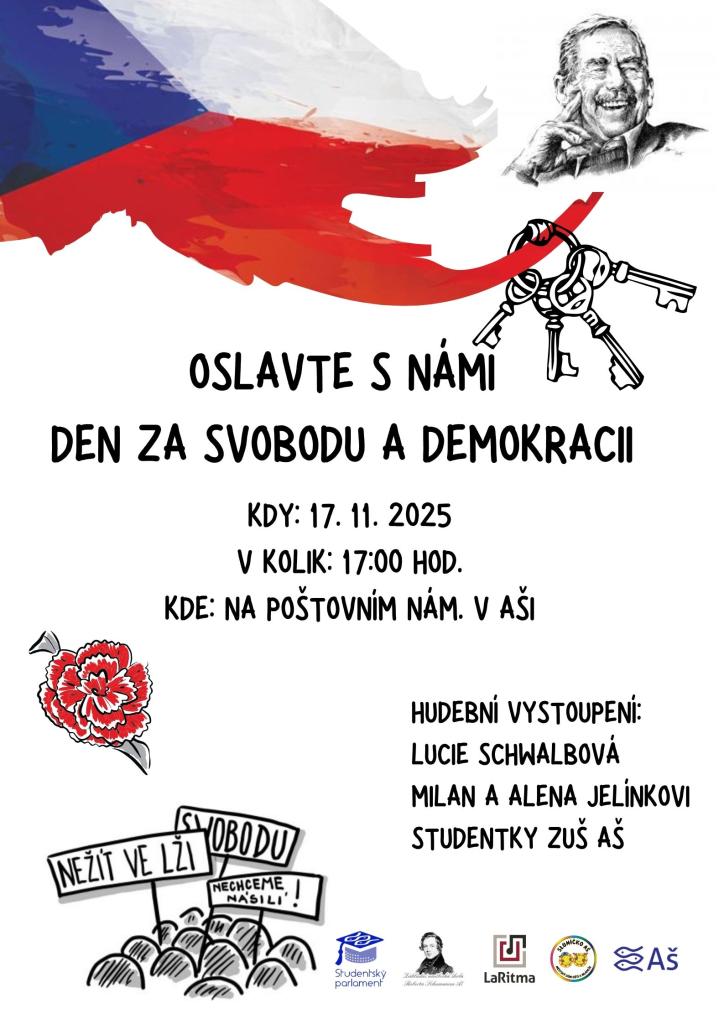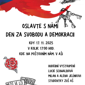 17.11.2025 Zveme vás na společné setkání u příležitosti Dne boje za svobodu a demokracii a Mezinárodního dne studentstva. Akce se uskuteční v pondělí 17. listopadu 2025 od 17:00 hodin na Poštovním náměstí v Aši. Společně si připomeneme význam listopadových událostí a hodnoty svobody, demokracie a obč...