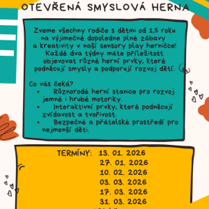 13.01.2026 Smyslíkova hernička: Otevřená sensory play herna pro rodiče s dětmi od 1,5 roku Zvu všechny rodiče s malými dětmi na jedinečné dopoledne plné zábavy a kreativity v naší Smyslíkově herničce! Každých 14 dní máte možnost prozkoumávat různé herní prvky, které stimulují smysly a podporují rozvoj dět...