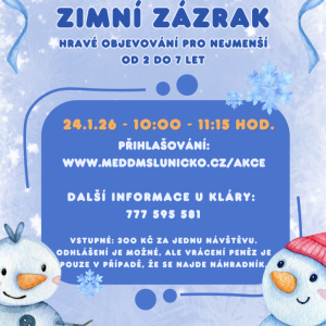 24.01.2026 Smyslík nabízí možnost pro malé objevitele a jejich rodiče zaměřenou na učení hrou a smyslové vnímání, které rozvíjí kognitivní funkce, soustředění, motoriku, kreativitu a fantazii. Nabídneme minimálně 6 různých aktivit. Představíme si různá témata – od tajemství zvířecího světa, přes atmosféru s...