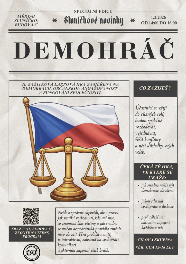 01.02.2026 DEMOHRÁČ - zážitková hra o demokracii Jak to vypadá, když demokracie funguje… a když přestane fungovat? Na úvod si společně projdeme skutečné příběhy ze světa, které ukazují různé podoby demokracie a moci. Poté se účastníci přesunou do samostatné LARPové hry. DemoHRÁČ je interaktivní zážitko...