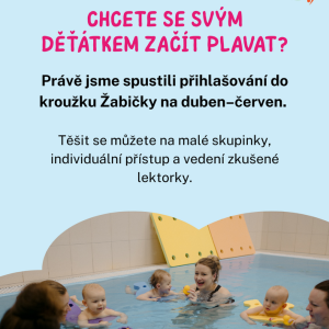 13.04.2026 Formou her a zábavných aktivit budeme děti ve věku 6 měsíců až 1 rok učit základním plaveckým dovednostem, jako jsou dýchání do vody, splývání a orientace ve vodě. Klade se důraz na bezpečné zvládnutí vodního prostředí a vybudování kladného vztahu k vodě. Plavání by mělo být příjemnou aktivitou j...